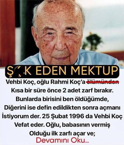 Söyle beni çoraplarım ile gömsünler.” Rahmi Koç, cenazeyi yıkayan imama durumu söyler, fakat böyle bir şeyin dinen uygun olmadığı cevabını alır. Bunun üzerine Rahmi Koç durumu müftüye iletir. Fakat müftüden de mümkün olmadığı yönünde cevap alırMecburen vasiyetten vazgeçen Rahmi Koç, babasının defin işlemleri tamamlandıktan Sonra 2. zarfı açar. Zarfta şöyle yazmaktadır: “Bak oğlum, ahirete bir çift çorap bile götüremedim. Günümüzde maalesef ki, her başarıyı para ile bağdaştıran bir sistem var. Oysaki değerli olan, doğru amaç için harcanan emek ve zamandır. Dipnot: Vehbi Koç’un bu zarfları verdiği rivayet edilir, gerçeklik payı bilinmemektedir.